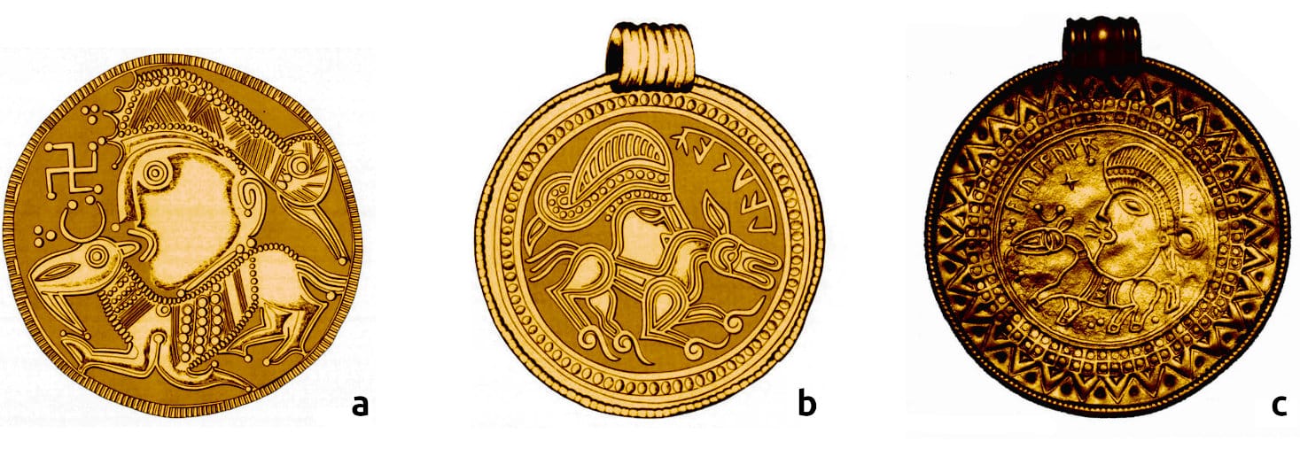 [⁸] Andrén, A. (1991). Guld och makt // Samfundsorganisation og Regional Variation. Aarhus. — О связи брактеатов с римскими медальонами и формульных слов с латинскими аналогами.